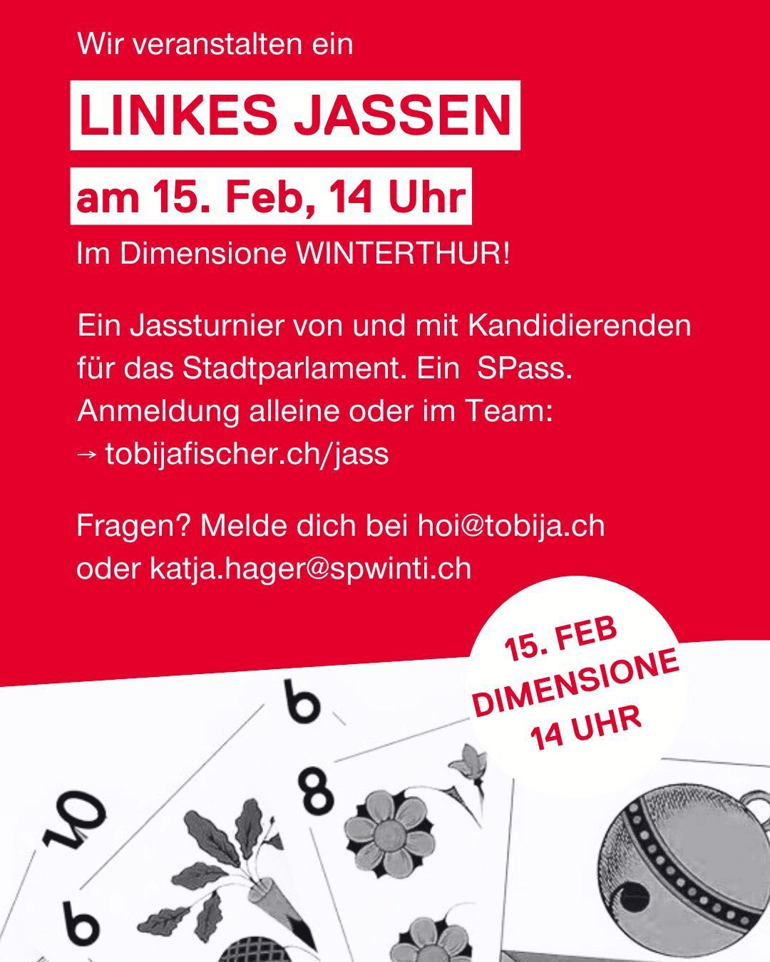 Was? -> Jass-Plauschturnier Wann? -> 15. Februar, 14 - 18 Uhr Wo? -> Robi's Dimensione, Neustadtgasse 25, 8400 Winterthur Ein Jassturnier für alle, organisiert von und mit Kandidierenden für das Winterthurer Stadtparlament. Wir freuen uns auf einen gemütlichen Jass-Nachmittag, mit oder ohne politische Gespräche. Du darfst völlig unvorbereitet (aber angemeldet) auftauchen – wir erklären alles […]